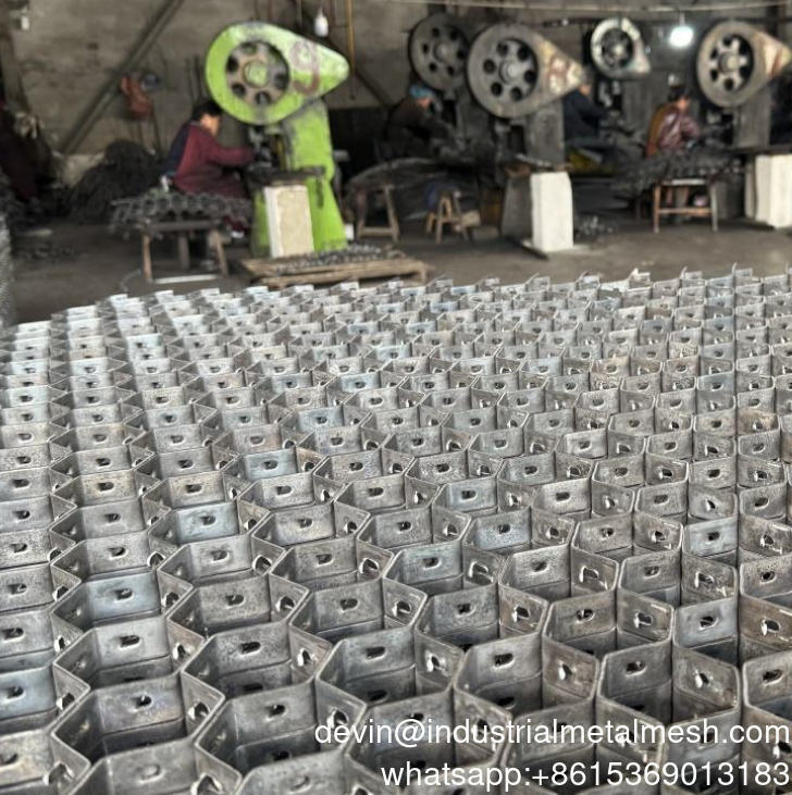 Hex Mesh with lances is a hexagonal cellular mesh grating with punched lances which is specifically designed for reinforcing both linings and flooring. It acts as a surface framework to hold cement or refractory in position, and relieves stress in the lining's upper crust, which prevents spalling and cracking. As a result of hex metal's strength and unique design, abrasion and corrosion are retarded and refractory life is significantly extended. Even hot gaseous substances cannot erode the refractory because they are reflected away from the surface by the metal cellular grid.